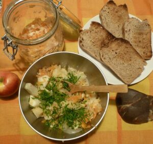 Vous revenez de la distribution du mercredi, vous choisissez de manger quelques épinards en salade, et vous faites cuire votre céleri-rave à la vapeur avec des oignons jaunes en lamelles. Vingt minutes plus tard, c’est prêt. Votre sauce préférée et c’est déjà bon tel quel. Mais il y a dans votre frigo ce pot de coleslaw lactofermenté qui ne demande qu’à être rajouté pour relever votre bol. Il a été fabriqué il y a deux mois ou plus longtemps, avec du chou, des carottes, panais, navets et autres racines, le tout râpé, du sel, des graines de coriandre, de cumin, de moutarde. On mélange, on tasse, le jus s’exprime. Un bocal à rondelle de caoutchouc et fermeture métallique, une semaine à température ambiante, puis au frais. Ça fermente tranquillement et attend à la cave. Une fois ouvert, le bocal doit rester au réfrigérateur. Quelques cuillerées dans votre bol de céleri-rave vapeur, huile, tamari, sel, poivre, curry, un peu de ciboulette, (il manque les graines de sésame sur la photo). Les tranches de pain grillé des Trois parcelles attendent leur caresse de beurre. À tester, non ?