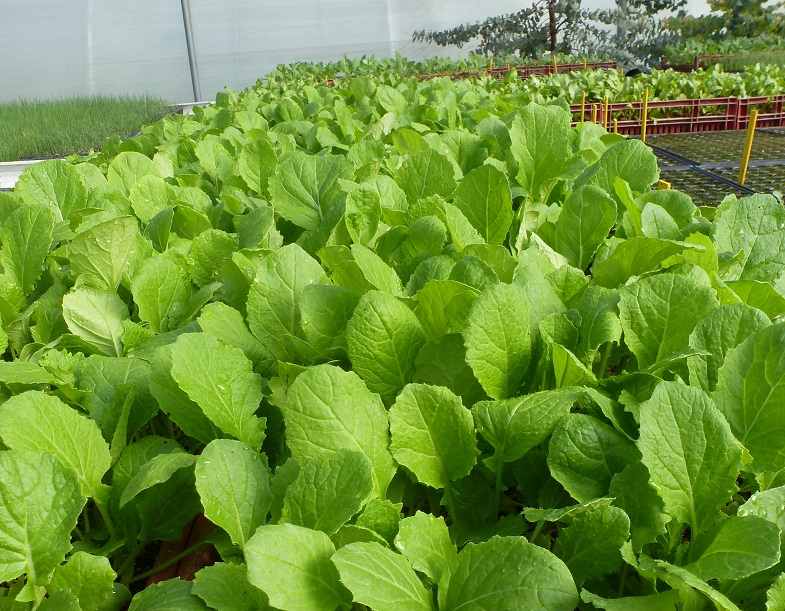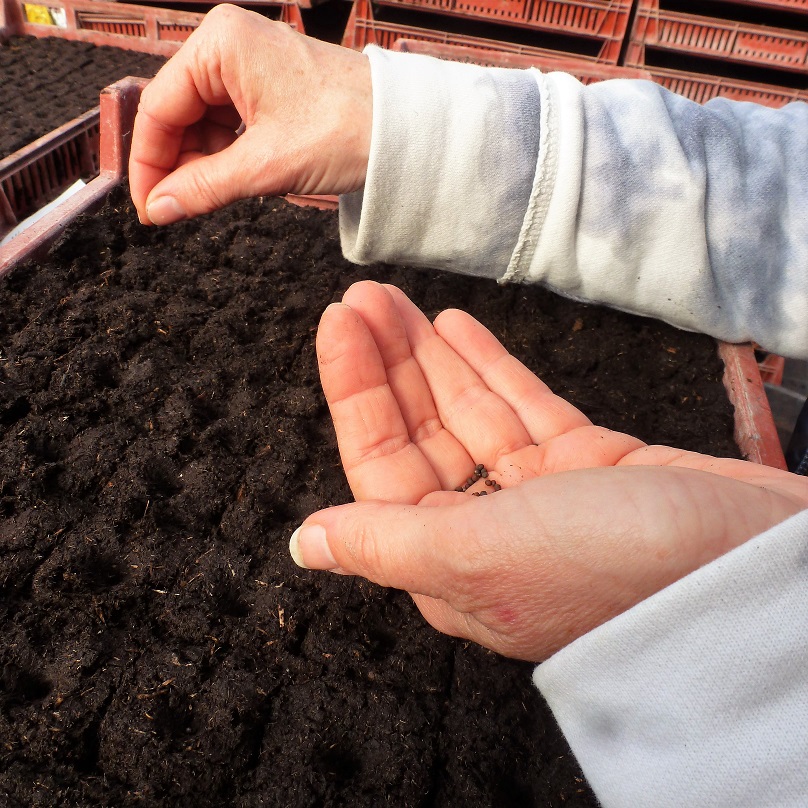 Temps frisquet, le chemin est boueux, on s’installe dans la grande serre. Au passage, on regarde les semis des semaines précédentes, d’un vert tendre prometteur. Semis aussi pour ce chantier : des haricots, deux par trou, et de minuscules graines noires [je ne me souviens plus de la variété], à saisir entre pouce et index et à déposer délicatement sans perdre le fil des rangées. Un travail de précision, quasi méditatif dans une atmosphère calme et concentrée. Les plaques se remplissent et Simon vient à la rescousse pour monter une nouvelle table, avec l’aide des deux enfants présents. Les plaques terminées sont recouvertes de terreau fin et de sable tamisé puis installées sur les grandes tables. Date et variété sont précisées sur chaque contenant.