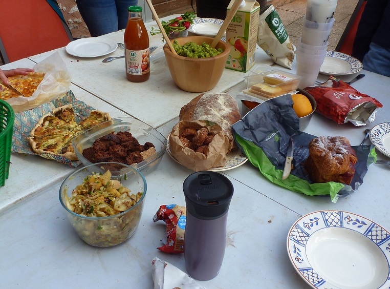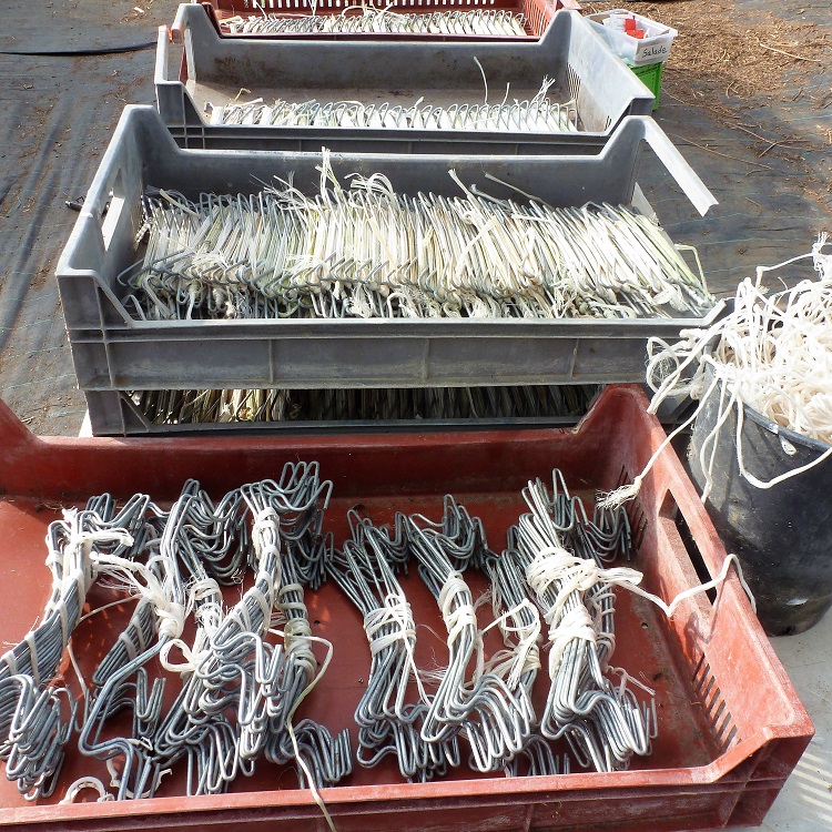 Mais les estomacs se rappellent à notre attention. Une grande table dressée dans la cour accueille les spécialités et surprises de chacun·e. L’après-midi, reprise des semis et cadeau pour celles qui aiment çà et ont envie de changer : un gros tas de fils et de tendeurs métalliques (système qui sert à guider les pieds de tomates à la verticale sous les serres, sans tuteurs) tout emmêlés, dont on est venu à bout bien avant le coucher du soleil ! Pour en savoir plus sur l’utilité de cette technique de culture, regarder cette vidéo de Xavier Mathias, jardinier bio : Enroulage : tuteurer ses tomates comme un pro, avec un système de nœud coulissant mais une bonne hauteur nécessaire. Un petit tour pédagogique final dans les serres pour glaner des conseils et cette conscience écologique motivante qui accompagne toujours les chantiers à la ferme. À l’entrée de cette serre, un gros tas de branchages secs de verveine pour abriter coccinelles et autres insectes auxiliaires, prêts à fondre sur les ravageurs qui auraient l’idée de s’attaquer aux plans parvenus à maturité. Une autre, réservée aux demoiselles carottes, aux allées calibrées, pour lesquelles l’équipe est aux petits soins… Une autre encore, où une épaisse couche de compost a été épandue — la différence de température est nettement sensible — les conditions sont réunies pour les cultures délicates à venir.