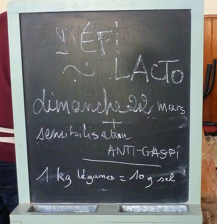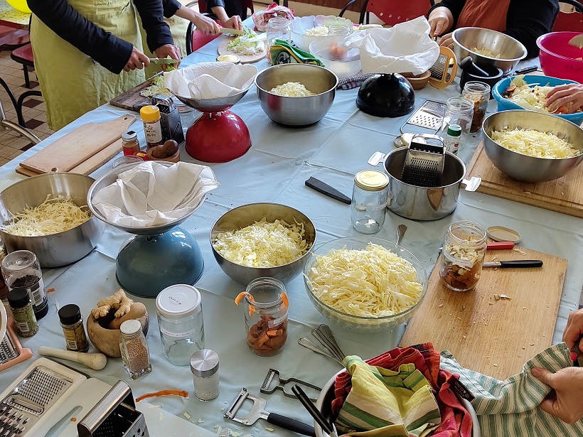Premier atelier du Défi Lacto des Radis Actifs : un groupe d’amapien·nes et quelques invité·es s’est réuni le dimanche 22 mars au local habituel de distribution pour découvrir ou améliorer leur connaissance de la lactofermentation. On a surtout cherché à dissiper les inquiétudes ou défiances compréhensibles devant l’inconnu. Elles n’ont pas résisté, semble-t-il, à la pratique et à la fabrication d’une recette idéale pour débuter : celle d’un mélange de légumes coupés fin pouvant relever une salade, une poêlée de légumes, un plat de riz, après plusieurs semaines ou mois de fermentation.