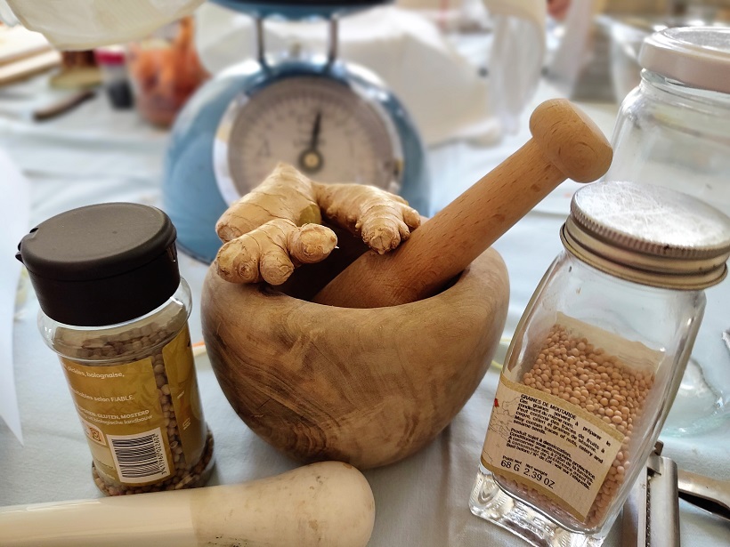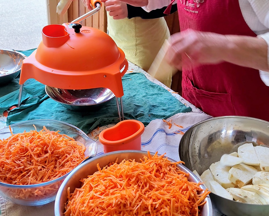 Objectif Coleslaw ! On s’installe autour de la grande table centrale avec les choux, l’ingrédient principal. Les couteaux entrent en action, les trognons valsent, les lanières s’alignent sur les planches à découper. Les saladiers se remplissent. Après on se répartit les autres légumes à éplucher, trancher, râper. Nous avions à notre disposition dans le panier offert par les Trois Parcelles pour notre atelier : outre les choux, des carottes, céleris-raves, poireaux et oignons. Après répartition des légumes, pesage des saladiers, pesage du sel, ajout d’épices (graines de moutarde, poivre, genièvre, cumin), de gingembre, de ciboulette, un peu de piment, et d’éventuelles sélections personnelles. Puis malaxage quelques minutes et un quart d’heure de repos.