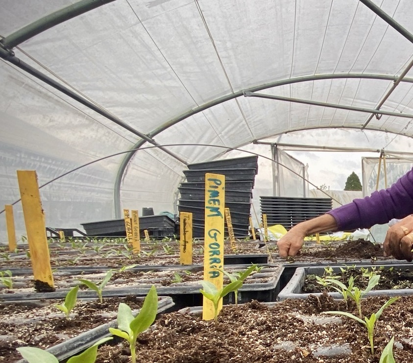 À l’arrivée à la ferme des Trois Parcelles, on est accueilli autour d’un café accompagné de pains et de gâteaux — maison, bien sûr –. Les participants ont pu prendre le temps d’échanger et de faire connaissance, au-delà du rendez-vous hebdomadaire de la distribution du mercredi soir. La matinée s’est poursuivie par la répartition des équipes entre les serres et les champs, pour les plus vaillants. Sous un ciel annoncé menaçant, on s’est attelé aux différentes tâches nécessaires à l’avancée des cultures. Finalement, la météo s’est montrée plus clémente que prévu : la pluie annoncée s’est limitée à une fine bruine qui n’a en rien entamé l’enthousiasme des équipes. Avant de se mettre au travail, Simon a pris un moment pour nous expliquer certains gestes techniques. Par exemple, pour repiquer les plants de poivrons, il faut les installer dans des pots plus grands pour que les racines puissent se développer à leur aise pour pousser dans de bonnes conditions. Il nous a également montré comment désherber les rangs de fraisiers, ou enlever les adventices sans abîmer les plants.